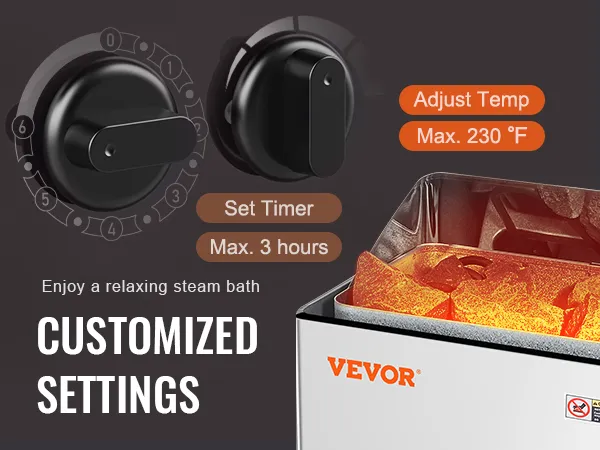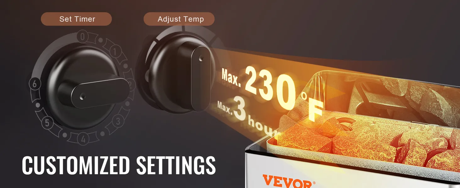 Adjust the Temp and Time: The home sauna heater features user-friendly mechanical knobs for temperature and time control, providing you the flexibility to personalize your sauna experience based on your comfort. With a maximum temperature of 230℉ and a timing capability of up to 3 hours, you have full control over your sauna session