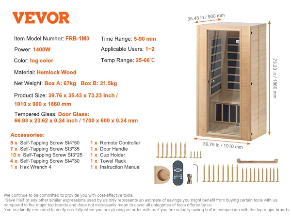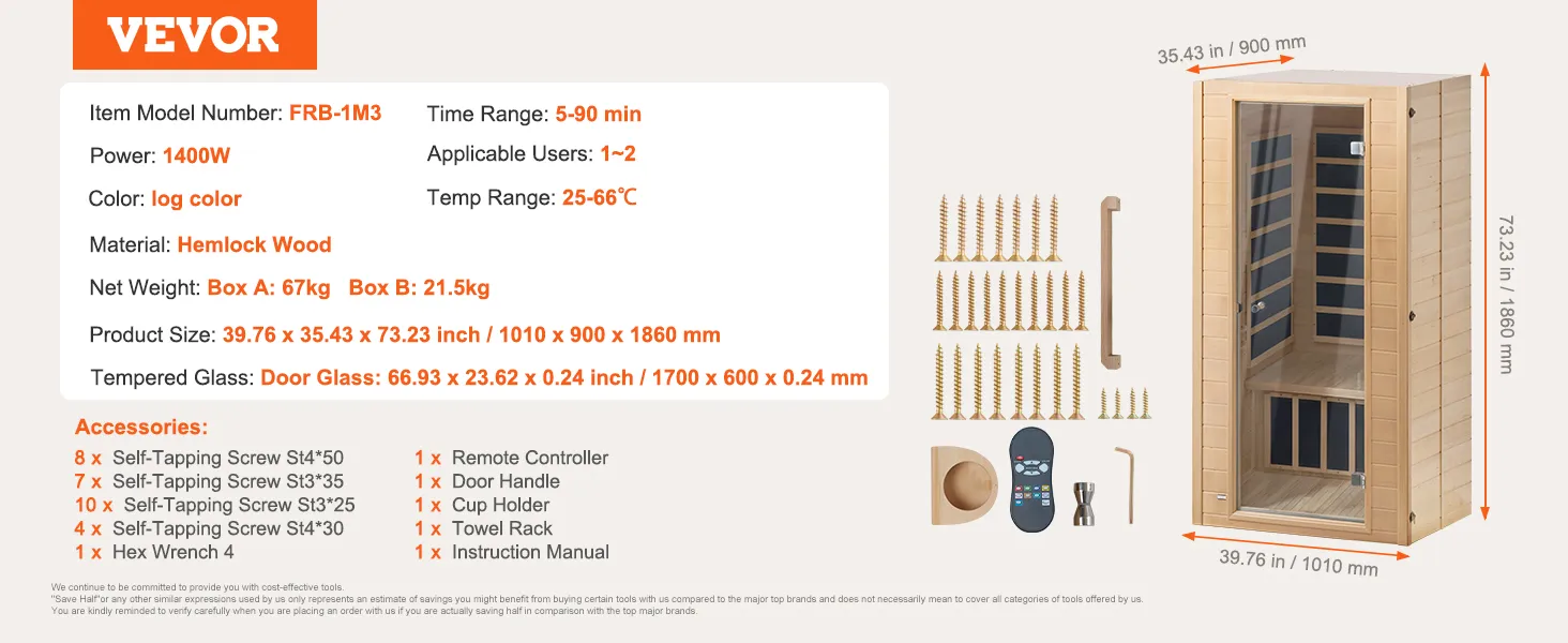 20 Sq.ft Mini Size: With a compact size of just 39.76 x 35.43 x 73.23 inches, this mini sauna room provides an ultimate relaxation experience for one person. It can be conveniently installed in your living room, bedroom, basement, or even a personal gym.