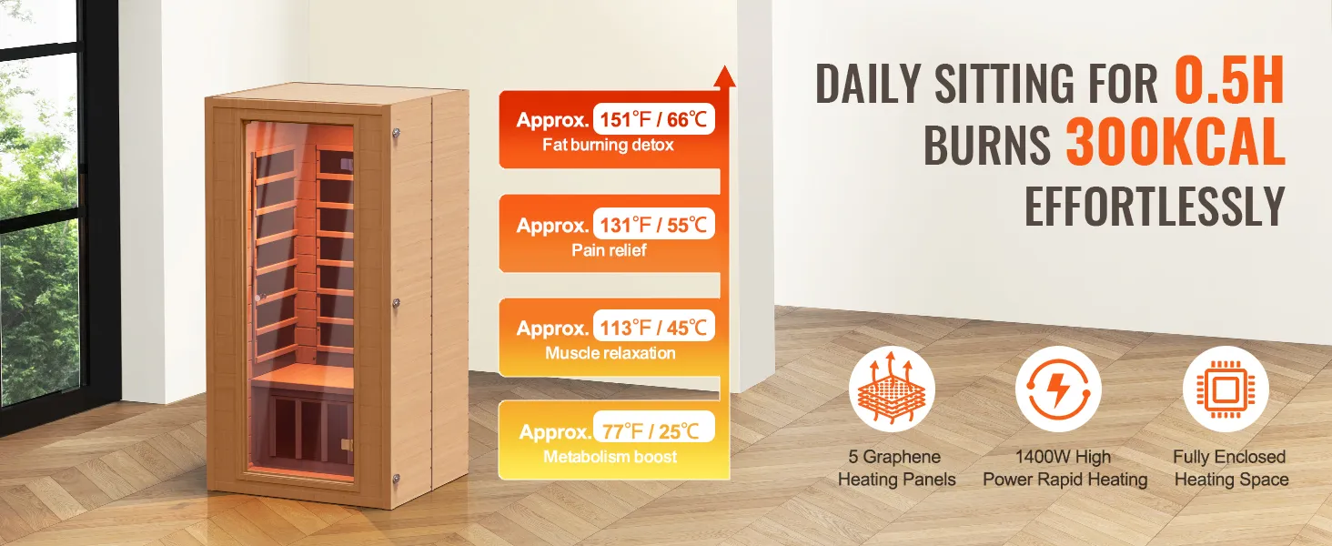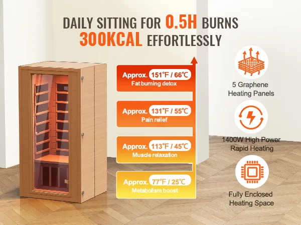 Safe and Easy Fat Burning: With a powerful 1400W fast-heating system, the sauna offers a wide heating range from 77℉ to 151℉. It is ETL certified for safety with an EMF radiation value ≤ 3MGS. The built-in far-infrared graphene heating panel can burn approximately 300Kcal in just 30 minutes daily, helping you achieve a fit body without strenuous exercise.