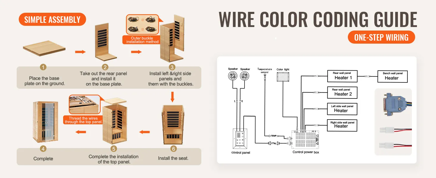 The wiring uses color-coded prompts, making the connections simple and straightforward. We provide a complete wiring diagram to help you easily follow and successfully install the sauna.