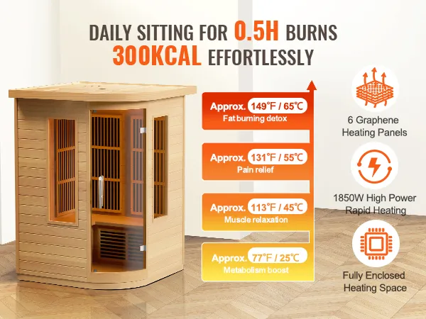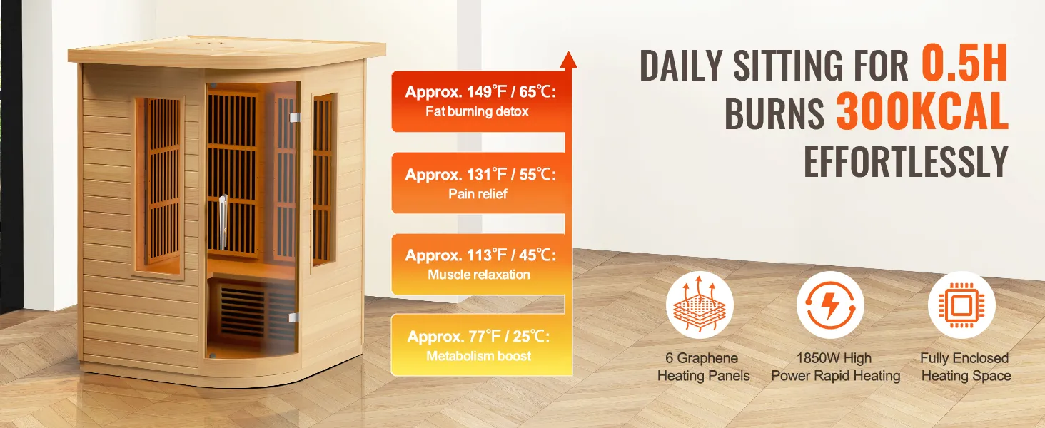 Safe and Easy Fat Burning: With a powerful 2000W fast-heating system, the sauna offers a wide heating range from 77℉ to 149℉. It is ETL certified for safety with an EMF radiation value ≤ 3MGS. The built-in far-infrared graphene heating panel can burn approximately 300Kcal in just 30 minutes daily, helping you achieve a fit body without strenuous exercise.