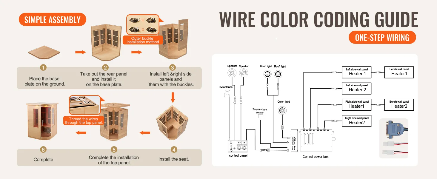 The wiring uses color-coded prompts, making the connections simple and straightforward. We provide a complete wiring diagram to help you easily follow and successfully install the sauna.