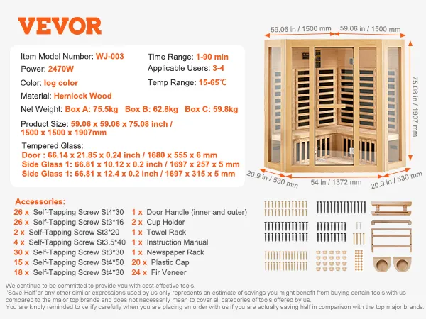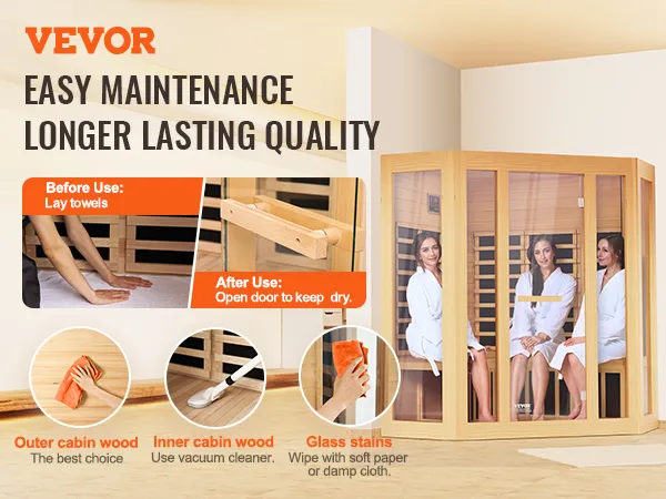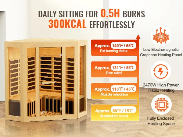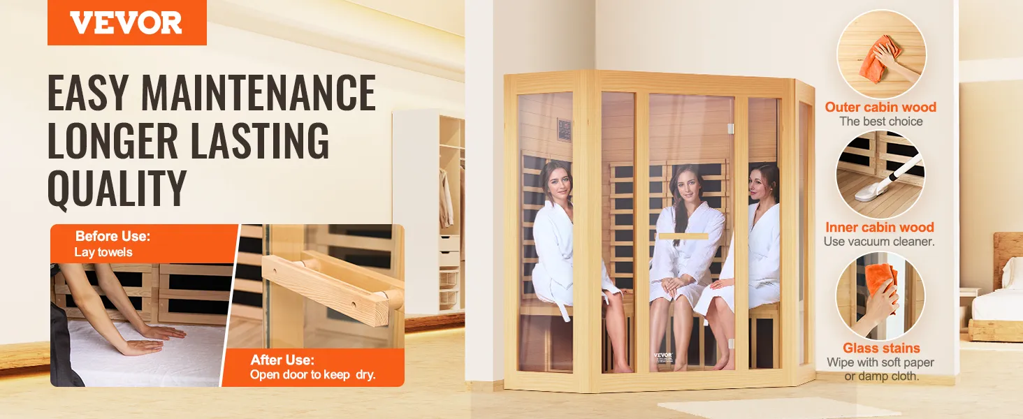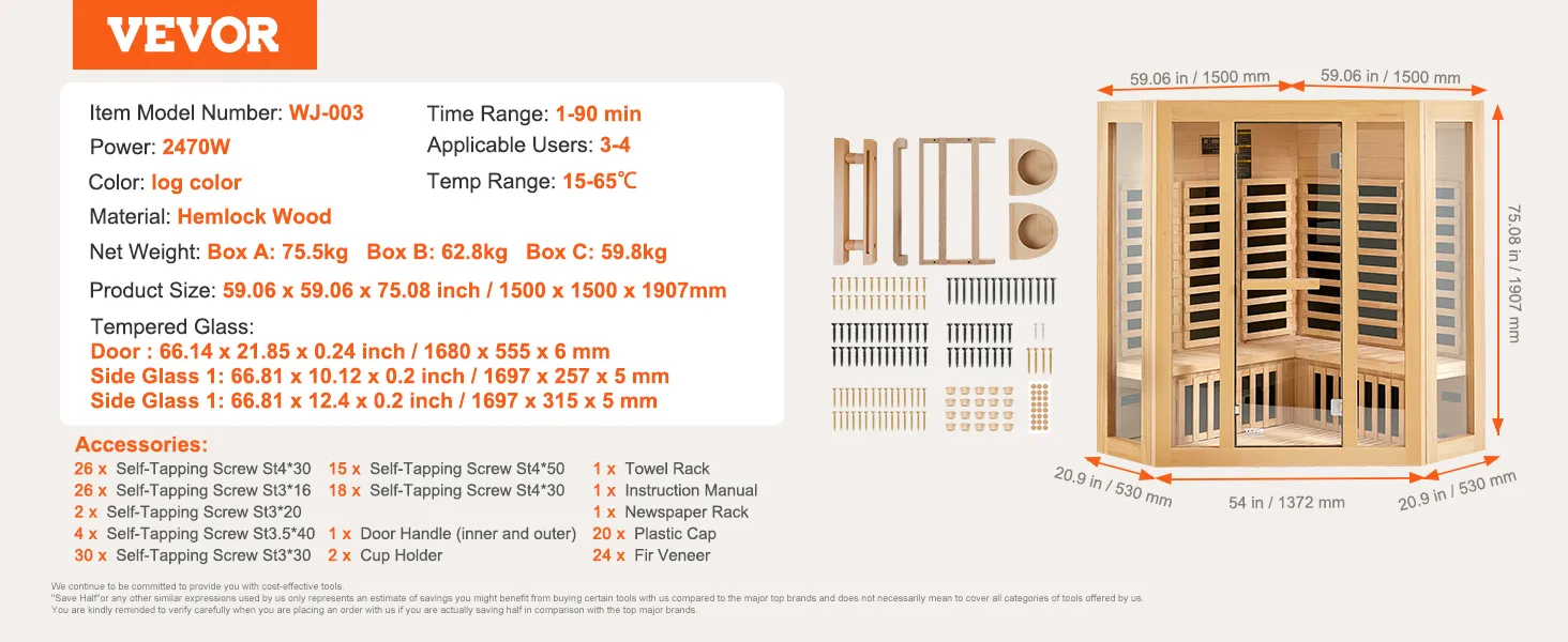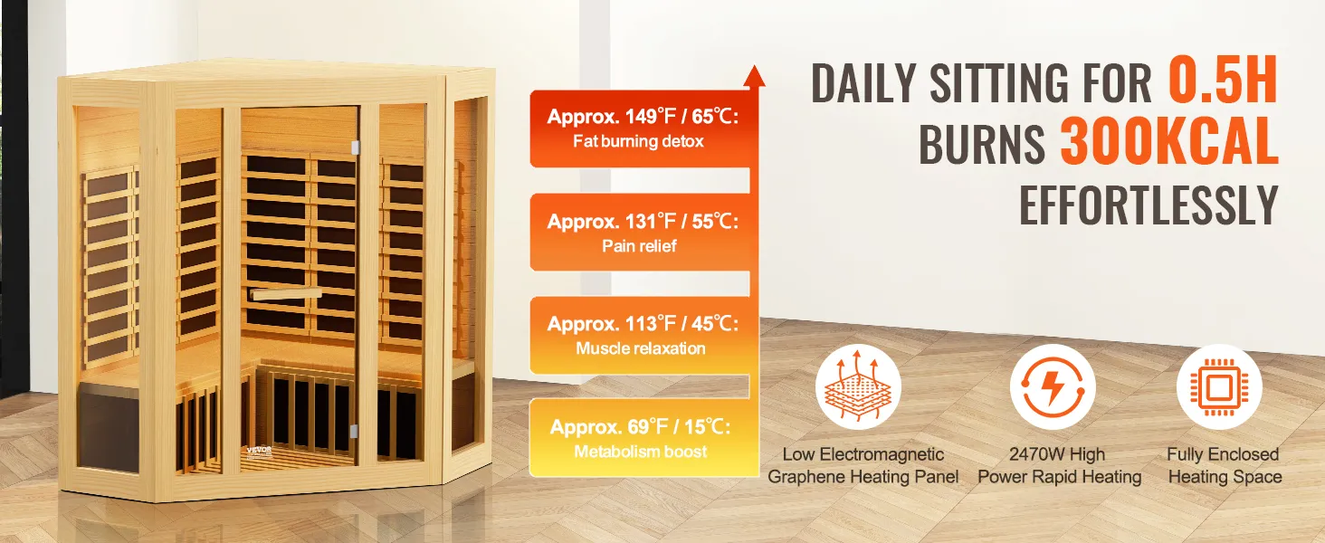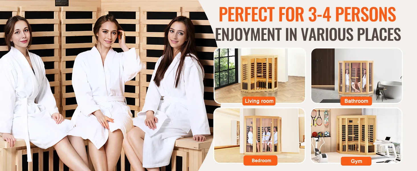 Perfect for 3-4 People: The spacious corner design doesn't take up too much floor space, allowing you and your friends or family to enjoy an ultimate, relaxing sauna experience anytime, anywhere. It can be conveniently installed in your living room, bedroom, basement, or even a personal gym.