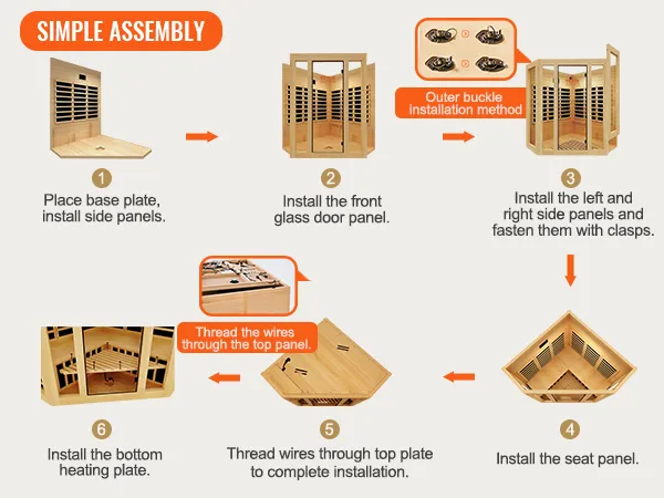 Pre-Assembled Design: The sauna room features a pre-assembled design, requiring only simple assembly upon receipt. Clear installation instructions and wiring diagrams are provided, eliminating the hassle of complicated screw fittings.