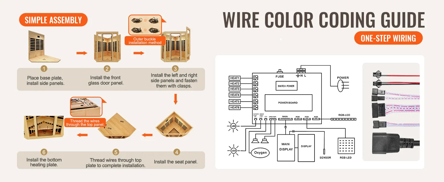 The wiring uses color-coded prompts, making the connections simple and straightforward. We provide a complete wiring diagram to help you easily follow and successfully install the sauna.