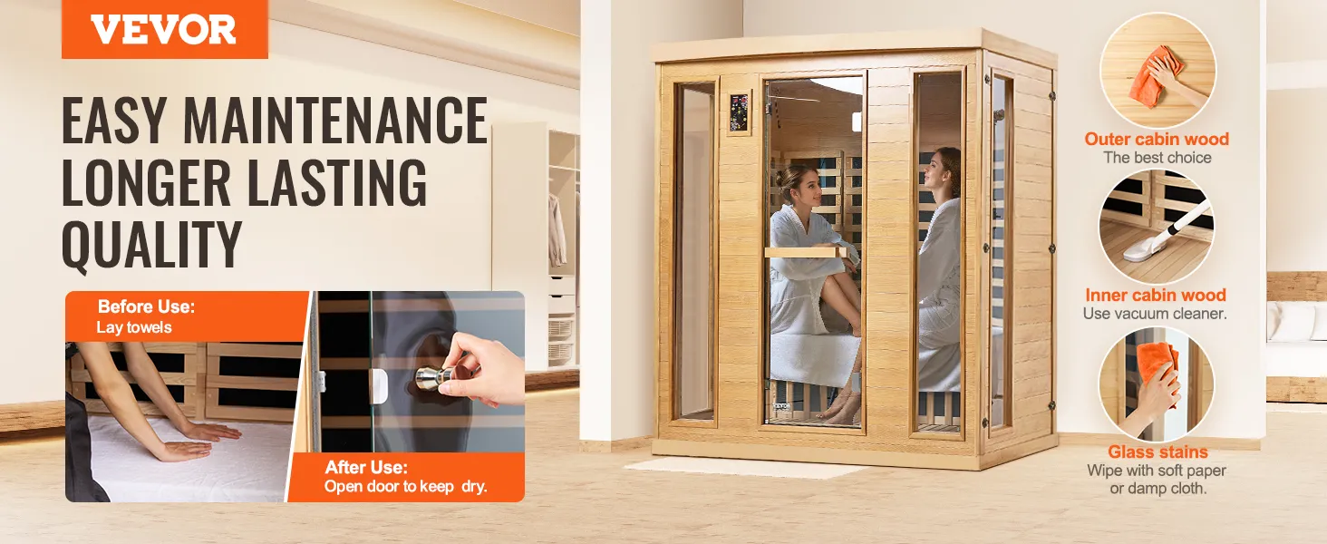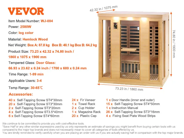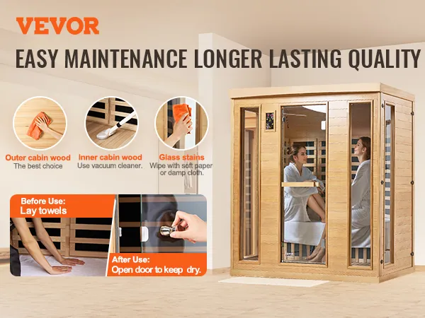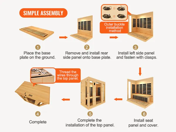 Pre-Assembled Design: The sauna room features a pre-assembled design, requiring only simple assembly upon receipt. Clear installation instructions and wiring diagrams are provided, eliminating the hassle of complicated screw fittings.