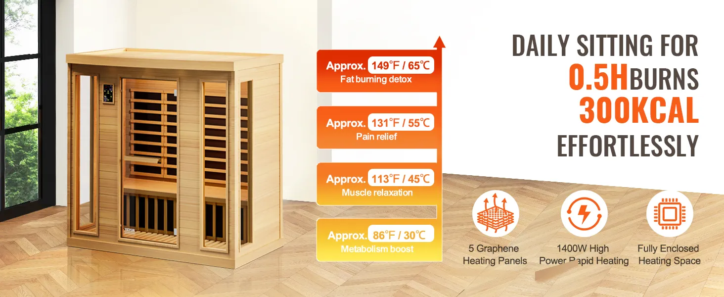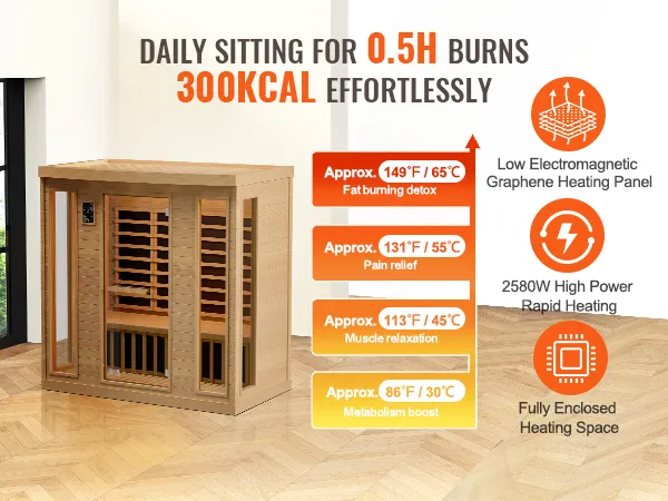 Safe and Easy Fat Burning: With a powerful 2580W fast-heating system, the sauna offers a wide heating range from 86℉-149℉. It is ETL certified for safety with an EMF radiation value ≤ 3MGS. The built-in far-infrared graphene heating panel can burn approximately 300Kcal in just 30 minutes daily, helping you achieve a fit body without strenuous exercise.