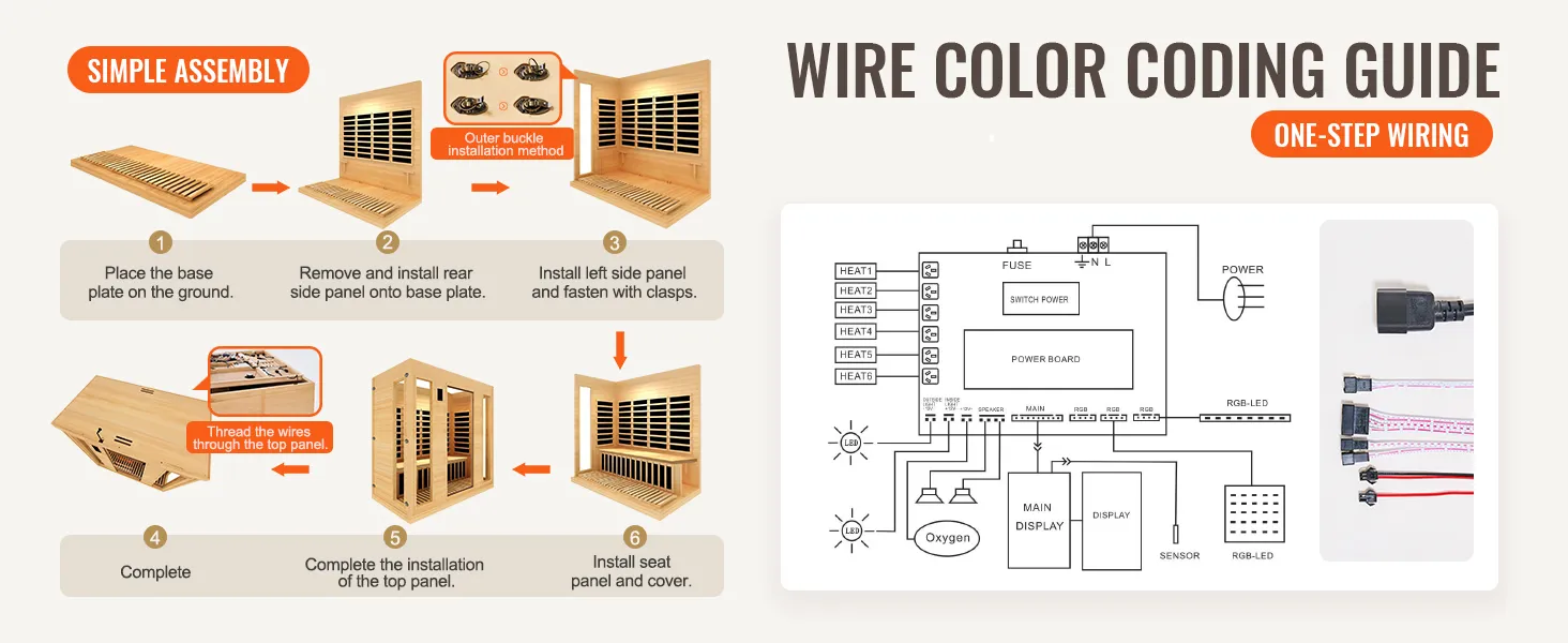 The wiring uses color-coded prompts, making the connections simple and straightforward. We provide a complete wiring diagram to help you easily follow and successfully install the sauna.