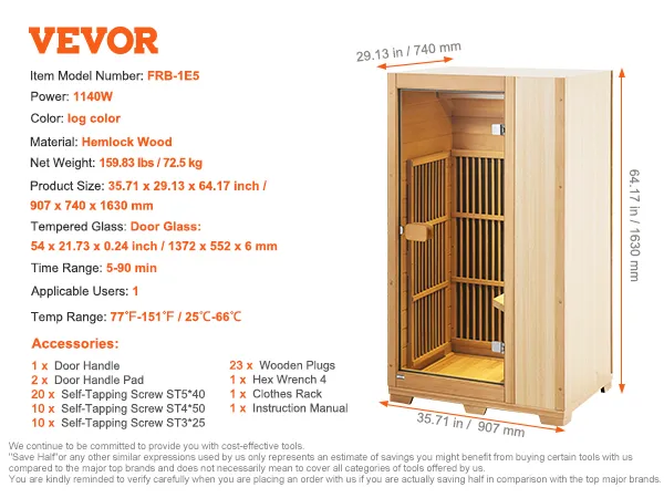 7.3 Sq.ft Mini Size: With a compact size of just 35.71 x 29.13 x 64.17 inches, this mini sauna room provides an ultimate relaxation experience for one person. It can be conveniently installed in your living room, bedroom, basement, or even a personal gym.