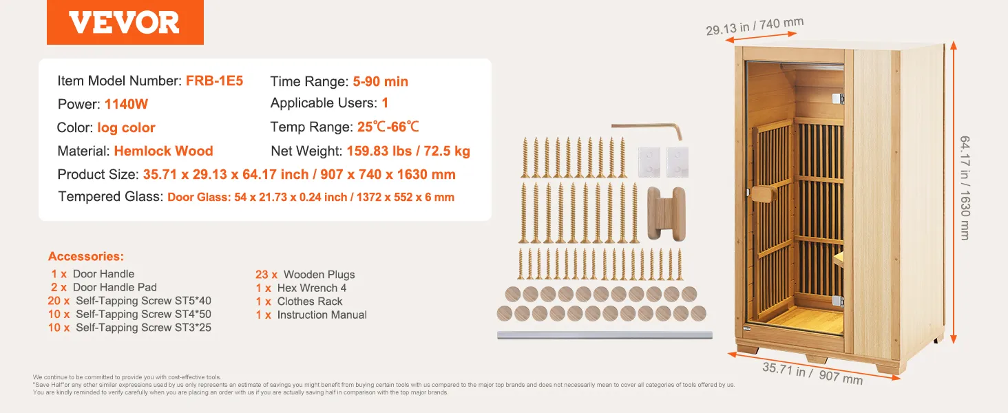 VEVOR Far Infrared Wooden Sauna, Room Home Sauna Spa for One Single Person, Low EMF Far Infrared Hemlock Wood Sauna with Tempered Glass Door & LED Reading Lamp & Bluetooth Speakers, 1140W Indoor Use
