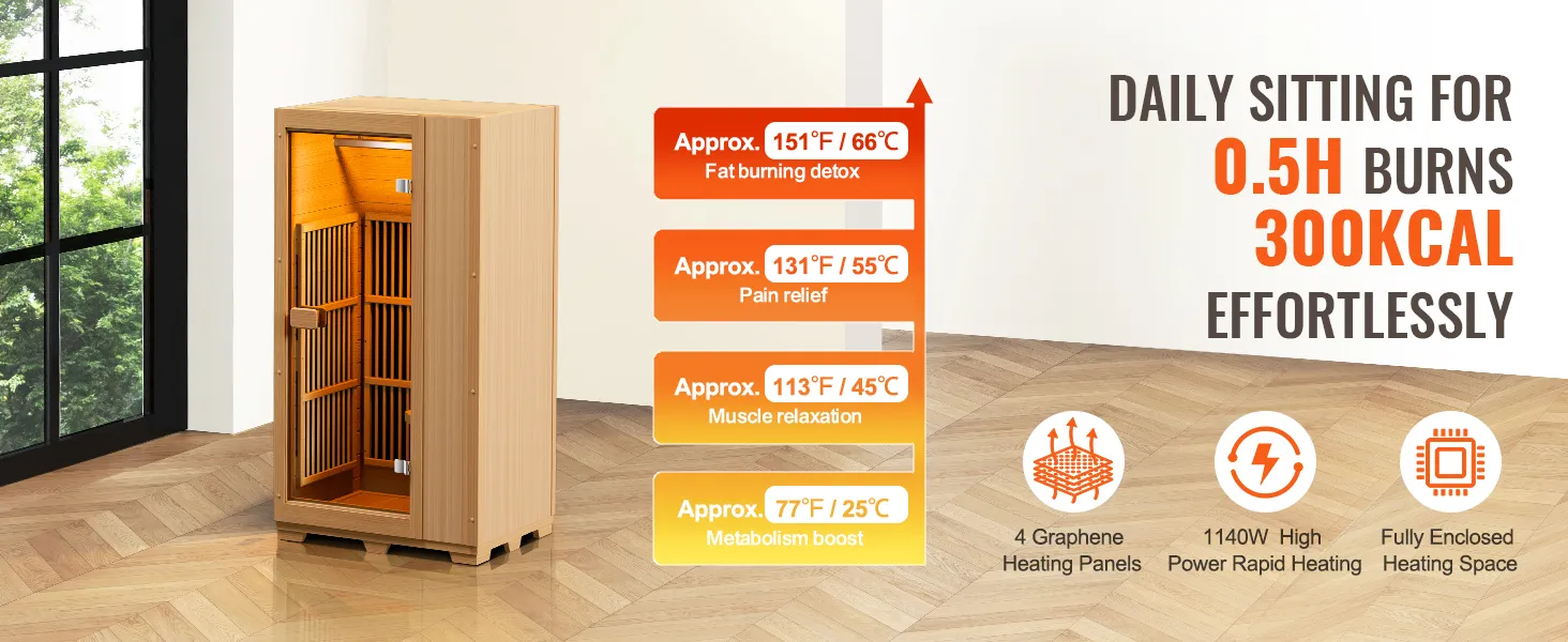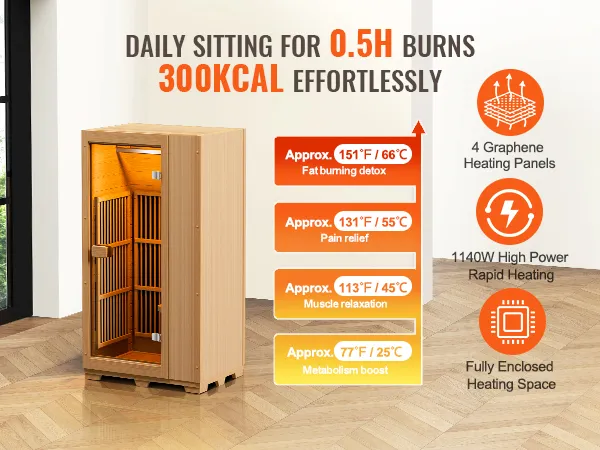 Safe and Easy Fat Burning: With a powerful 1140W fast-heating system, the sauna offers a wide heating range from 77℉ to 151℉. It is ETL certified for safety with an EMF radiation value ≤ 3MGS. The built-in far-infrared graphene heating panel can burn approximately 300Kcal in just 30 minutes daily, helping you achieve a fit body without strenuous exercise.