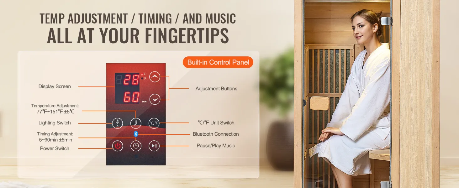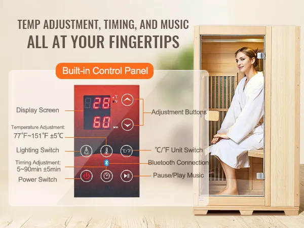 Intelligent Control PanelThe sauna room is equipped with a convenient built-in control panel, ensuring a perfect sauna experience. You can connect via Bluetooth to play your favorite music, making your sauna session even more enjoyable.