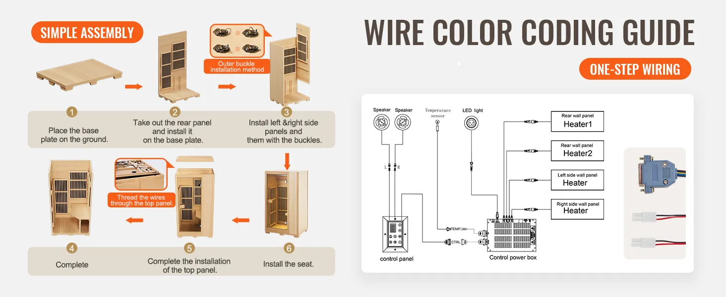The wiring uses color-coded prompts, making the connections simple and straightforward. We provide a complete wiring diagram to help you easily follow and successfully install the sauna.
