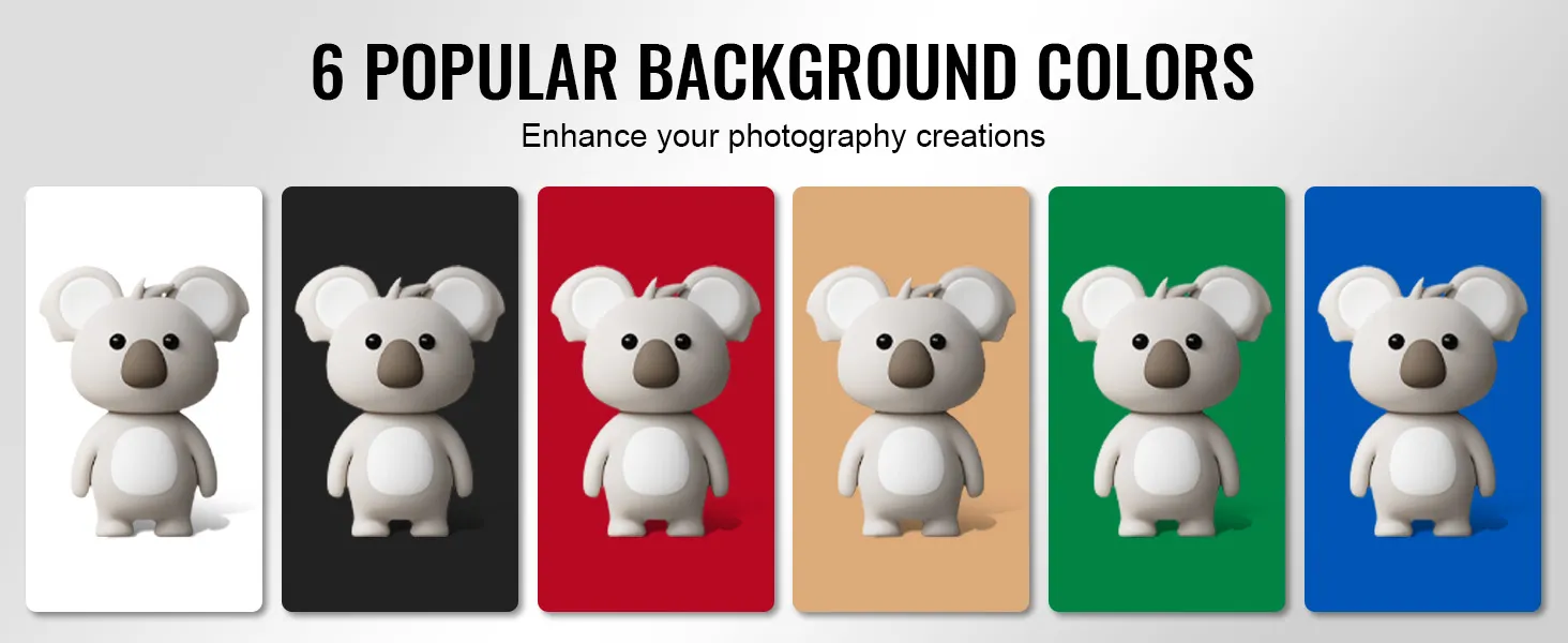 Vergroot uw creativiteit met onze 6 verwijderbare achtergronden (zwart/wit/oranje/rood/groen/blauw). Creëer eenvoudig verschillende achtergrondeffecten en themastijlen. Deze achtergronden zijn gemaakt van waterdicht PP-materiaal en zijn gemakkelijk schoon te maken en te vervangen.