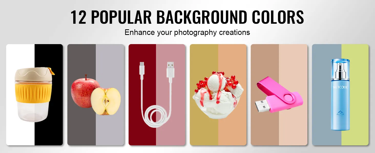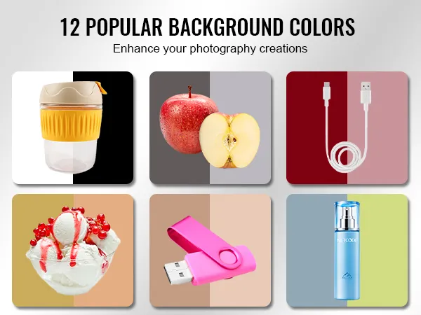 Verbeter uw workflow met 6 dubbelzijdige achtergronden die in totaal 12 kleuren bieden (zwart/wit/oranje/rood/groen/blauw). Creëer eenvoudig verschillende achtergrondeffecten en themastijlen om uw creatieve prestaties te verbeteren met onze fotolichtbak.