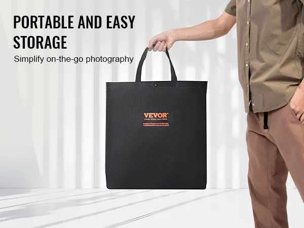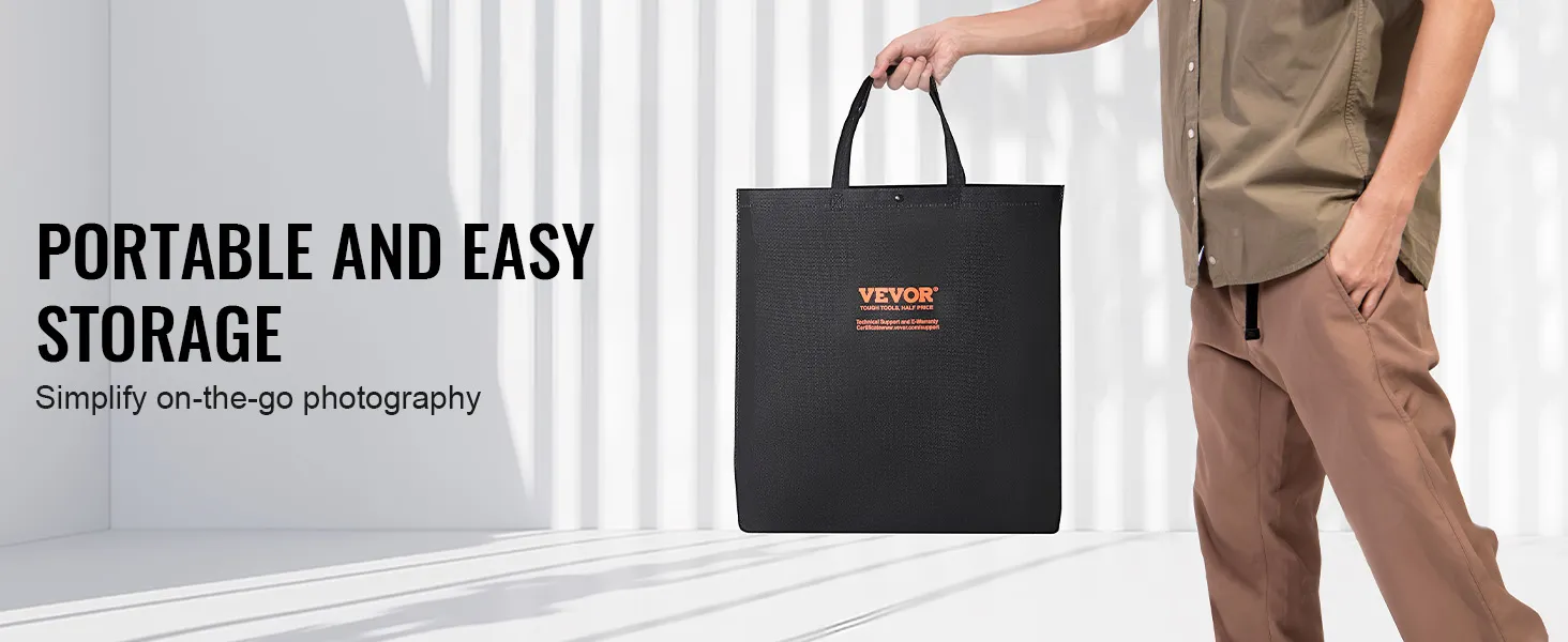 Directe installatie in enkele seconden: ervaar een probleemloze installatie met onze fotolichtbak, ontworpen voor snelle montage in slechts enkele seconden. Er zijn geen standaards, schroeven of ingewikkelde verlichtingsopstellingen nodig. Onze lichtbak wordt geleverd met een draagtas van non-woven stof voor gemakkelijk transport en is perfect voor het maken van foto's van professionele kwaliteit, waar en wanneer dan ook.