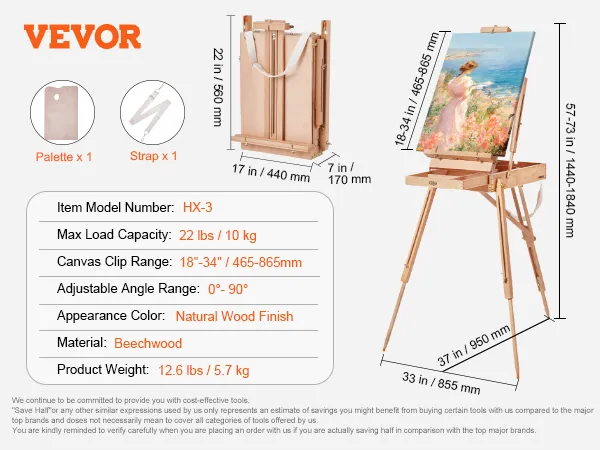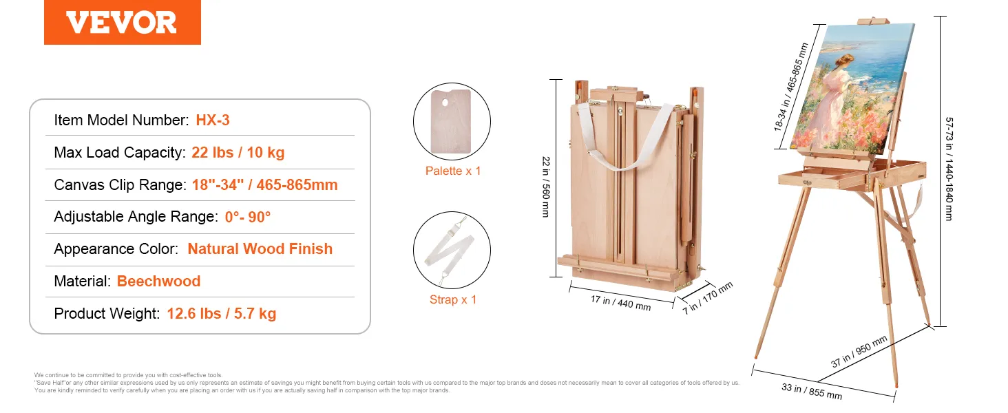 VEVOR Franse ezel voor canvas tot 86,36 cm, opvouwbare schetsdoos-ezel van beukenhout met lade, palet en riem, hoek- en hoogteverstelbaar, draagbare schilder-ezel