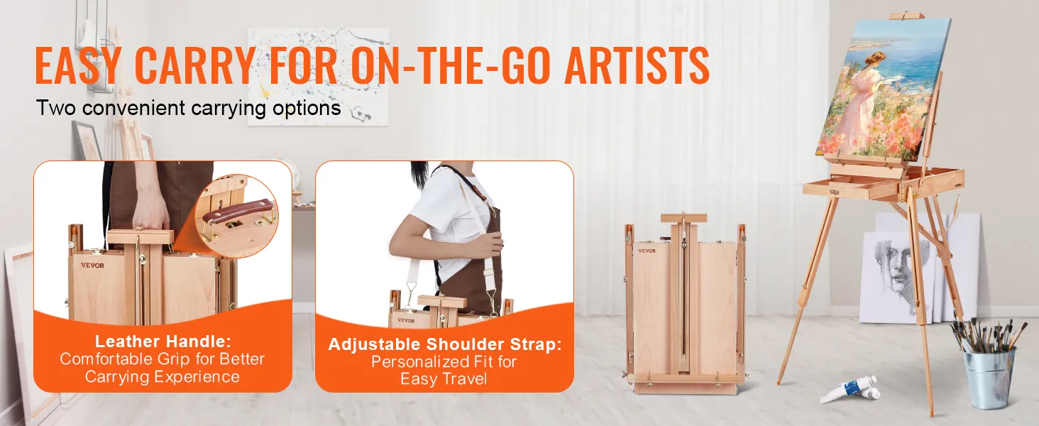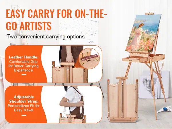 Kies tussen een zacht leren handvat of een verstelbare schouderband voor optimaal draagcomfort. Of u de schildersezel nu liever in de hand houdt of uw handen vrij heeft, elke draagoptie voor onze studio-ezel voldoet aan uw dagelijkse behoeften.