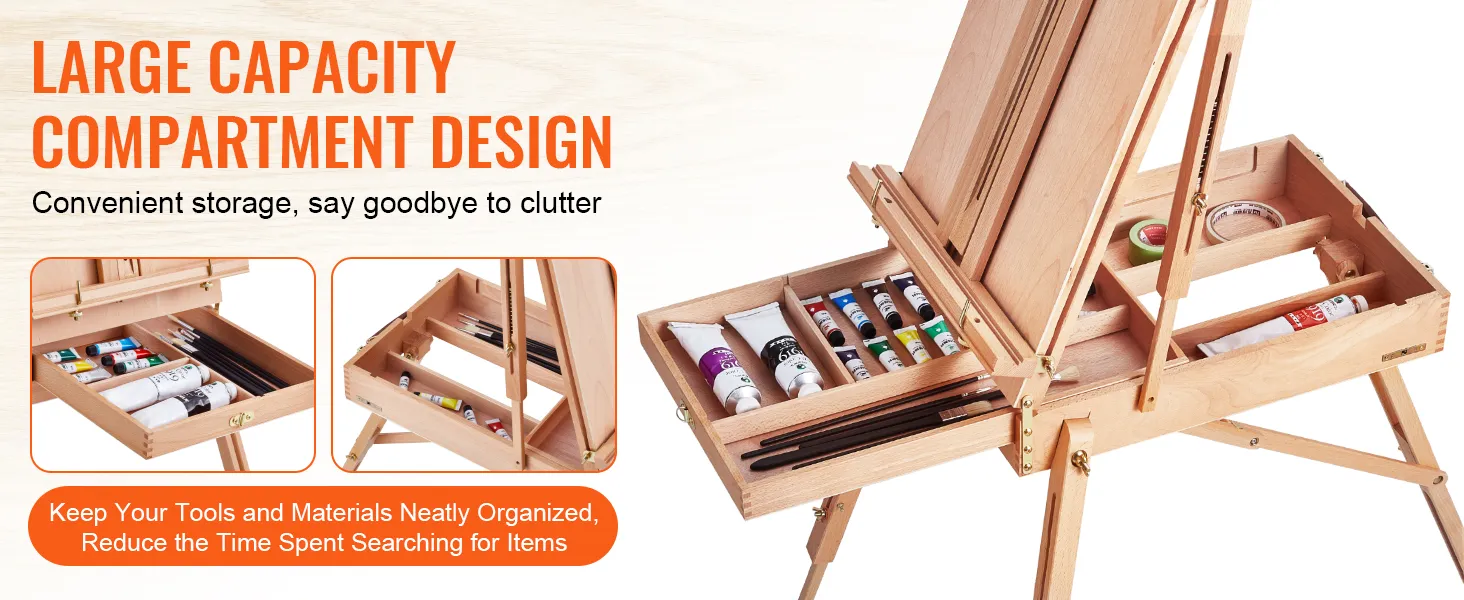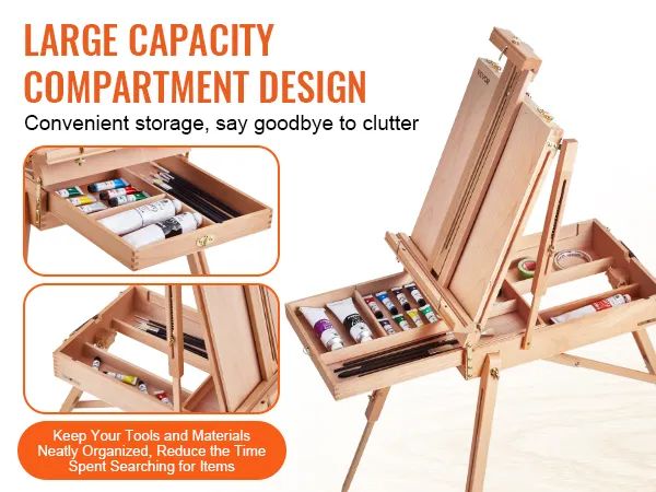 Ruime opslag: met dubbellaagse opbergladen aan de voor- en achterkant biedt deze studio-ezel voldoende, georganiseerde ruimte voor uw gereedschap, zodat u alles netjes geordend en binnen handbereik kunt houden, zodat u zich zonder afleiding op uw kunst kunt concentreren.