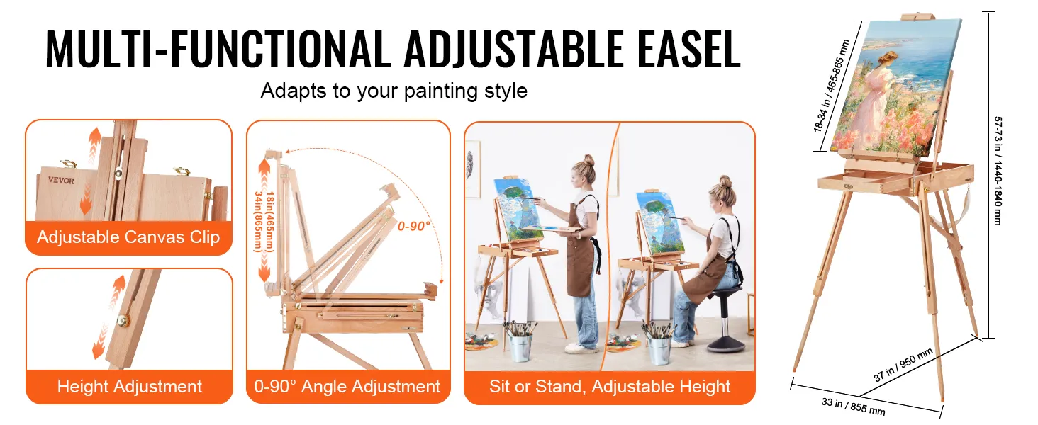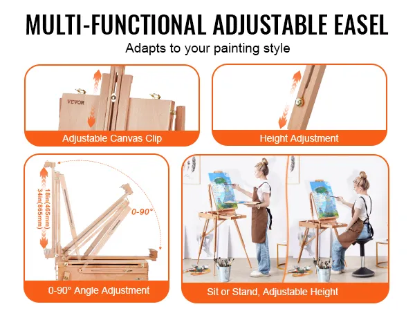 Deze ezel kan worden aangepast aan verschillende artistieke stijlen en is voorzien van een veilige, verstelbare canvashouder met verstelbare hoogte en kanteling. Elk detail is afgestemd op jouw creatieve stijl, zodat schilderen moeiteloos leuk wordt.