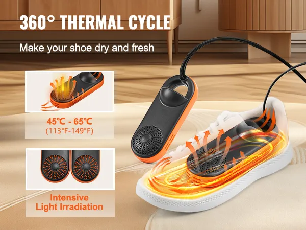 360° Warm Air Mode: Our shoe dryer uses thermal convection technology with multiple heat dissipation holes evenly distributed on the body. This design creates a circular warm air flow when heated, utilizing heat conduction and convection to evaporate moisture quickly. It ensures 360° drying from toe to heel with no dead spots, achieving better drying results in a shorter time.