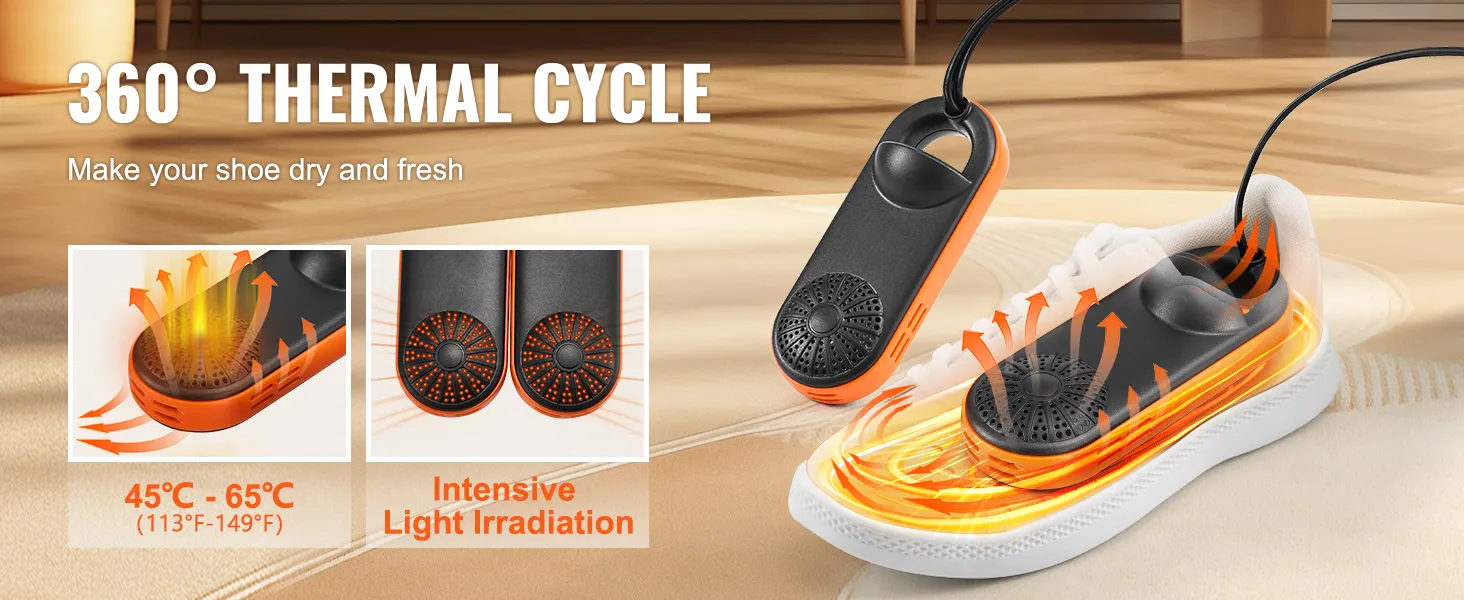 Deodorized Design: The UVA light evenly and densely irradiates, helping to reduce moisture and some odors, leaving shoes dry and fresh. The appropriate drying temperature of 45-65°C (113-149°F) prevents deformation, delamination, cracking, and aging due to excessive heat.