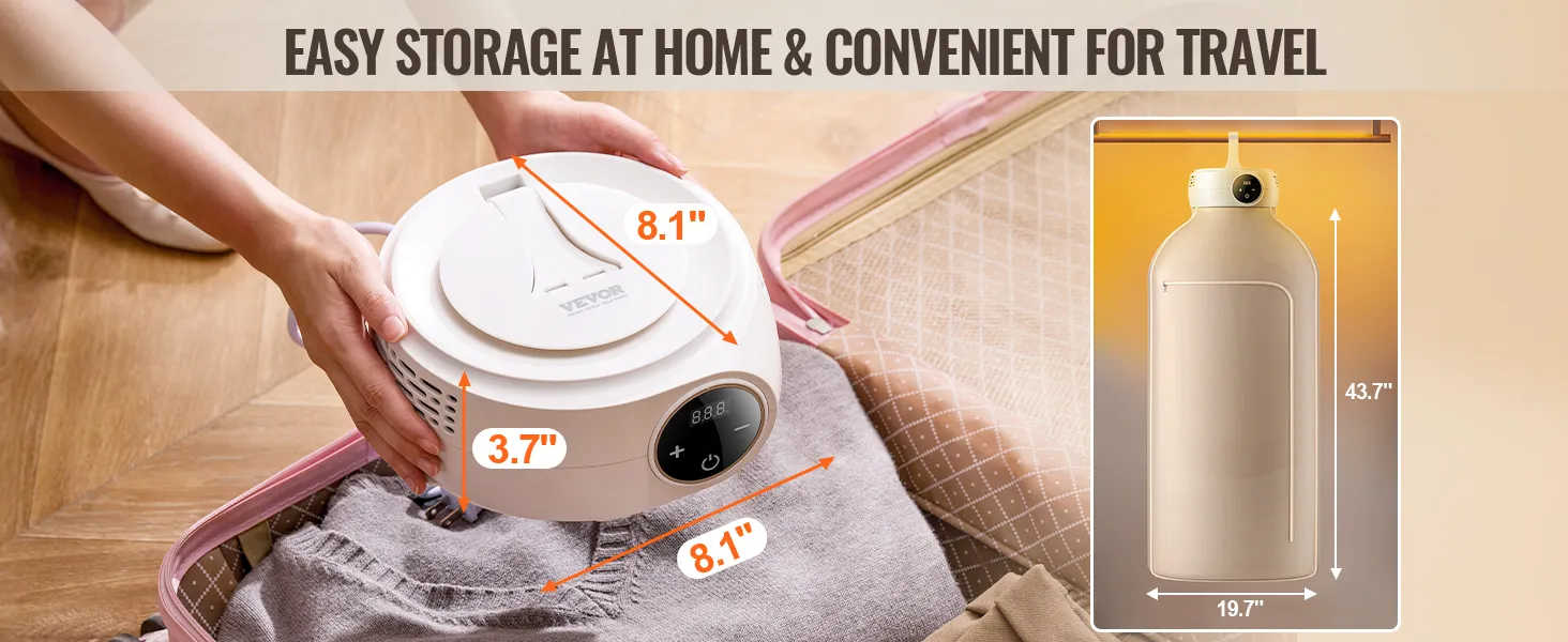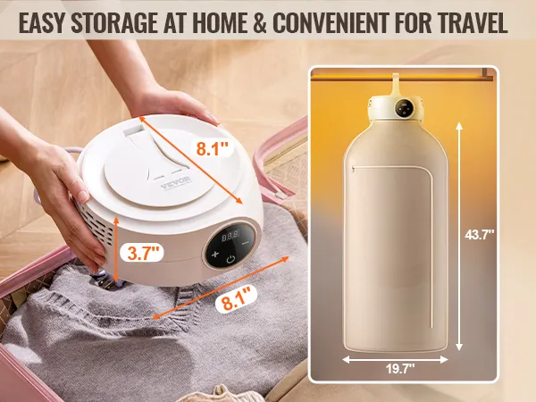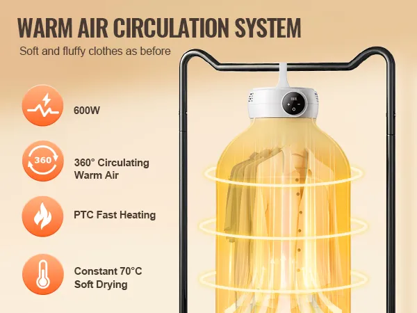 Efficiënt verwarmingssysteem: deze draagbare wasdroger maakt gebruik van een efficiënt PTC-warmtegeleidingselement en een convectiedroogsysteem aan de bovenkant om de warme lucht in alle richtingen te verdelen. Dit zorgt ervoor dat de hitte van hoge temperaturen snel in elke hoek van de kleding doordringt, waardoor hinderlijk vocht wordt geëlimineerd en de kleding droog en schoon blijft.