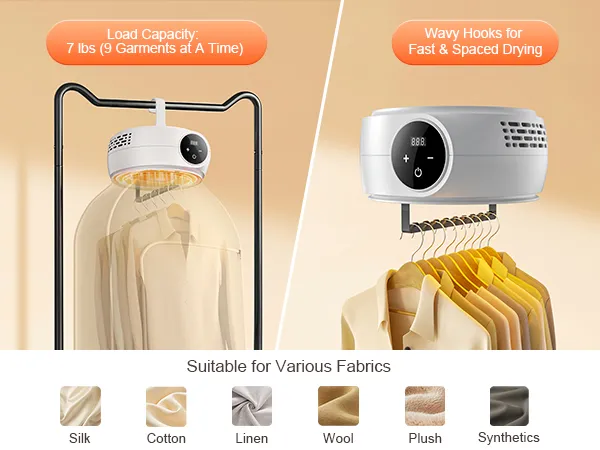 De draagbare wasdroger kan tot 9 kledingstukken van 3,2 kg drogen. De golvende ophanghaken en het gescheiden ontwerp voorkomen dat kleding aan elkaar plakt en zorgen voor een efficiënte droging van binnenuit.