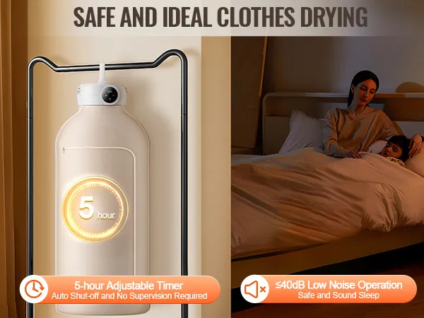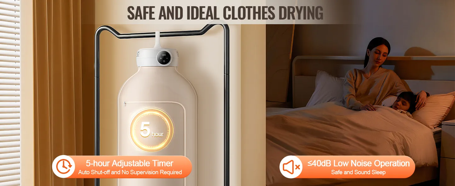 De droogtijd kan worden ingesteld tussen 30 en 300 minuten, afhankelijk van de dikte en vochtigheid van het wasgoed. Het apparaat schakelt na het drogen automatisch uit en werkt stil bij ≤40 dB om uw slaap niet te verstoren.