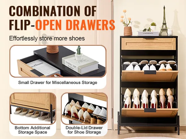 Ample Storage Space: The innovative flip-top drawer design enhances storage capacity, allowing us to accommodate more shoes and styles, including high heels and ankle boots.