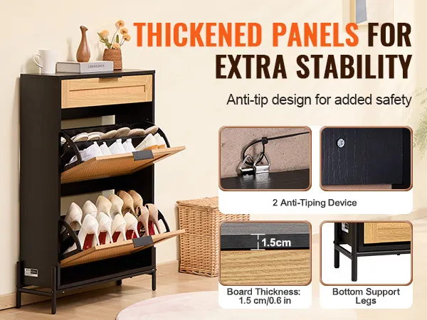 High Quality and Durability: Crafted from premium materials, the side panels and tabletop thickness have been reinforced to 15mm, greatly enhancing the stability and durability of this shoe storage entryway cabinet, enabling it to easily support multiple pairs of shoes.