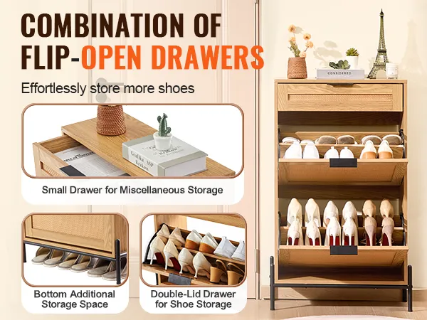Ample Storage Space: The innovative flip-top drawer design enhances storage capacity, allowing us to accommodate more shoes and styles, including high heels and ankle boots.