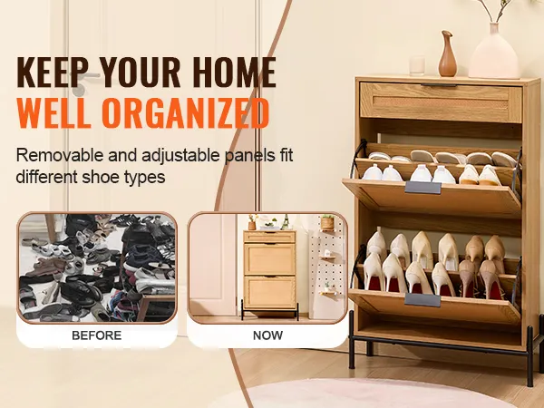 High Quality and Durability: Crafted from premium materials, the side panels and tabletop thickness have been reinforced to 15mm, greatly enhancing the stability and durability of this shoe storage entryway cabinet, enabling it to easily support multiple pairs of shoes.