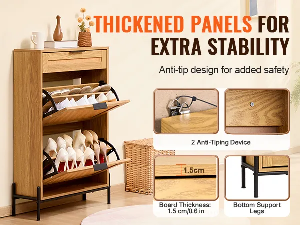 Crafted from high-quality materials, the side panels and tabletop thickness have been reinforced to 15mm, ensuring the durability and wear resistance of this shoe storage entryway cabinet, designed to withstand everyday use.