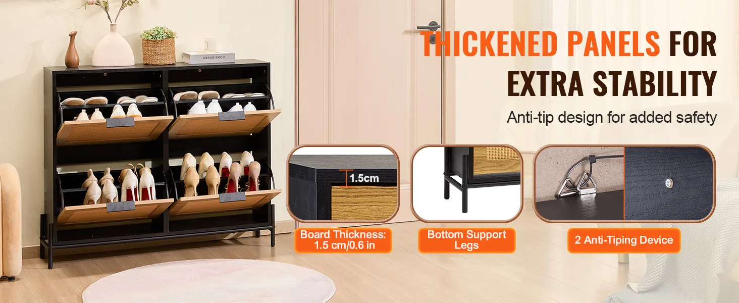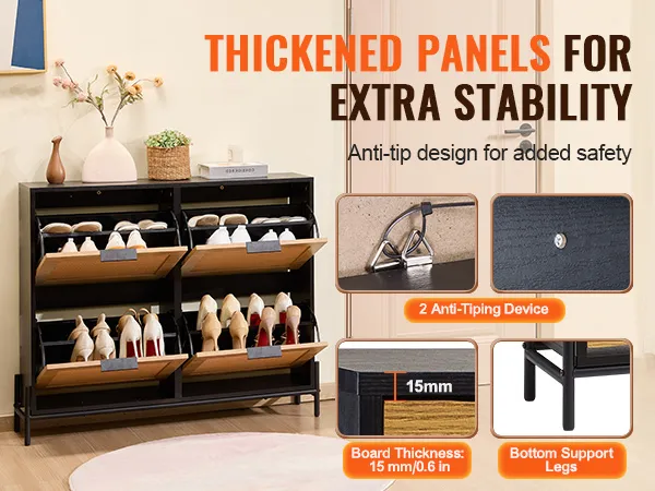 High Quality and Durability: Crafted from premium materials, the side panels and tabletop thickness have been reinforced to 15mm, greatly enhancing the stability and durability of this shoe storage entryway cabinet, enabling it to easily support multiple pairs of shoes.