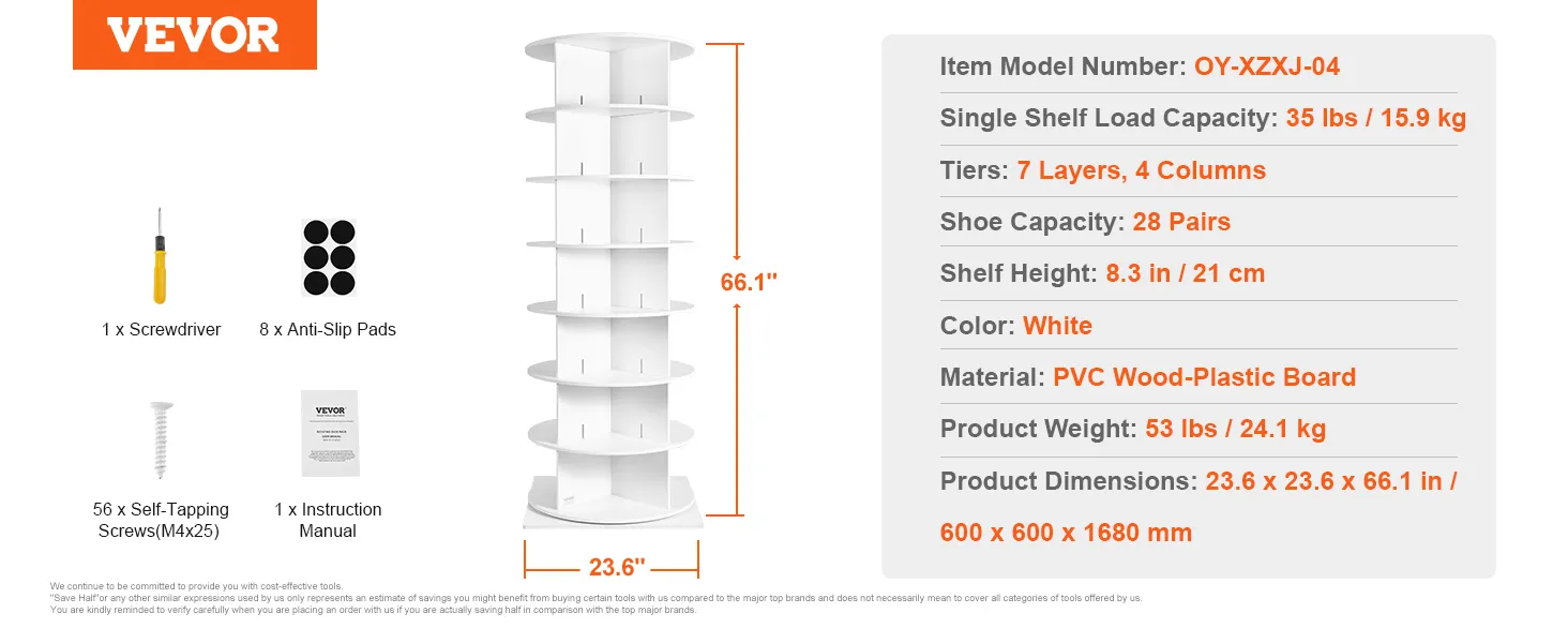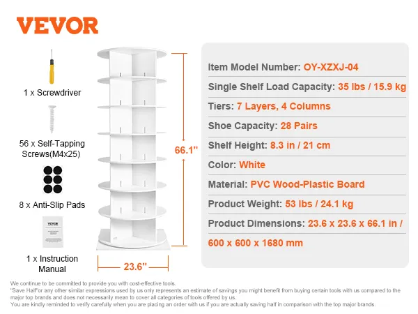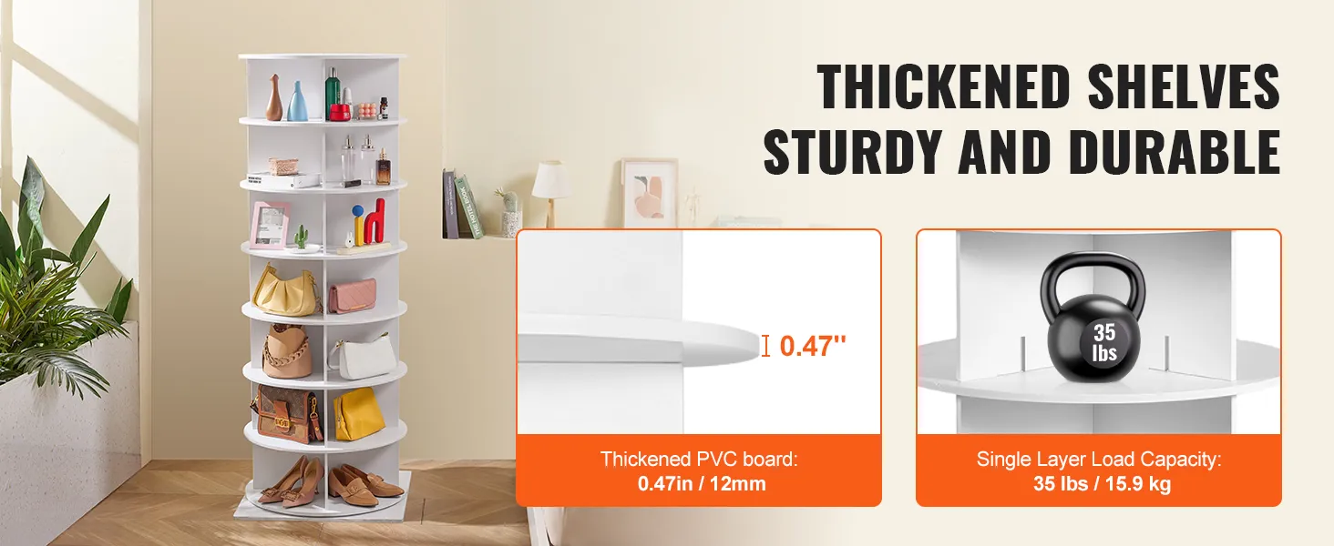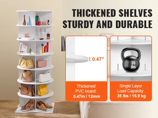 Deze draaibare schoenenkast met dikke planken is ontworpen voor een draagvermogen van maximaal 15,9 kg per plank. Of het nu gaat om schoenen of zware spullen, deze plank is ontworpen om alles veilig opgeborgen en gemakkelijk toegankelijk te houden.