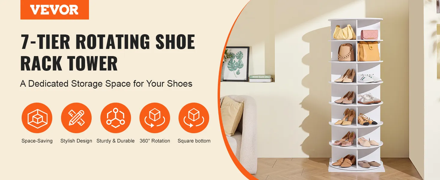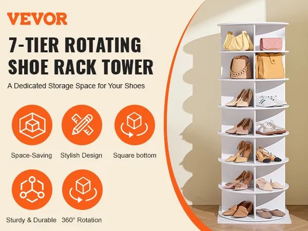 360° ROTATIE: Dit roterende schoenenrek met 7 niveaus combineert slimme opslag met gemakkelijke toegang, zodat u uw schoenen moeiteloos kunt ordenen en weergeven. Het 360° draaibare ontwerp zorgt ervoor dat je je schoenen snel en gemakkelijk kunt pakken en tegelijkertijd een stijlvol, draaibaar tintje aan je kamer geeft.