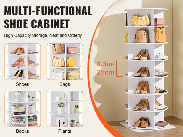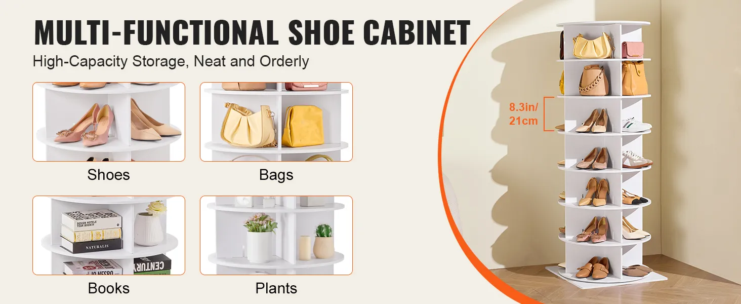 Ons roterende schoenenrek is meer dan alleen een plek voor schoenen. Het is een veelzijdige opbergoplossing waar je ook tassen, boeken en zelfs sierplanten in kunt opbergen. Alles heeft zijn plek en zorgt voor een opgeruimd en stijlvol huis.