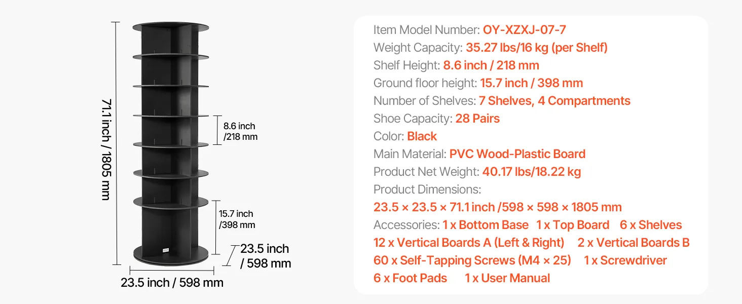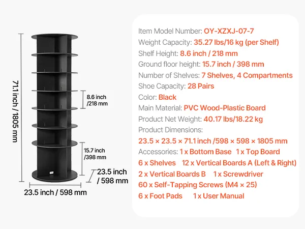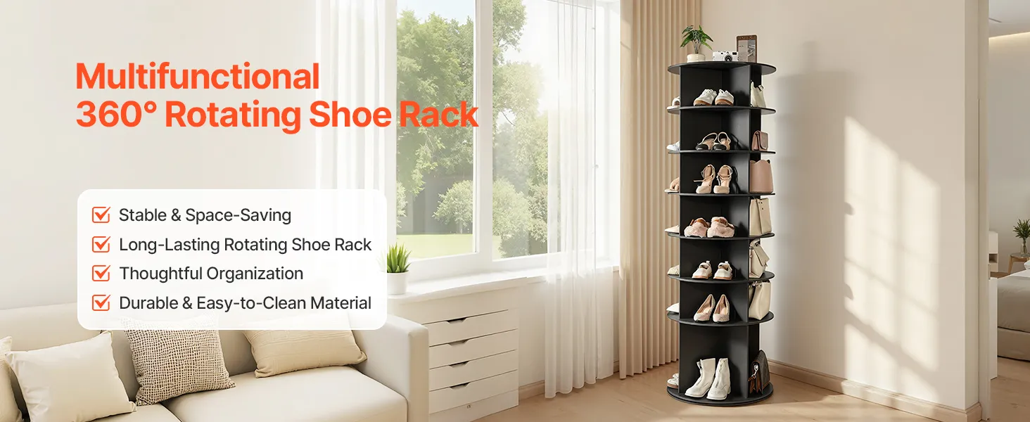 VEVOR Schoenenrek, Schoenenkast voor 28 paar schoenen (7 lagen), 360° draaibaar, Ruimtebesparende schoenenopbergoplossing, Schoenenrek voor slaapkamer, woonkamer, hal, Zwart, 598 x 598 x 1805 mm