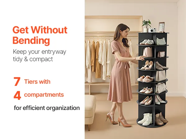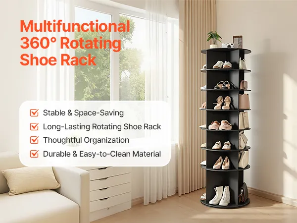 360° draaibaar ontwerp: Dit draaibare schoenenrek heeft een 360° draaibare voet en vier vakken. De binnenhoogte van 21 cm biedt ruimte aan verschillende soorten schoenen, terwijl de onderste plank van 40 cm hoog ideaal is voor het opbergen van laarzen. Zeg vaarwel tegen frustrerend zoeken en de noodzaak om snel bij je schoenen te kunnen.