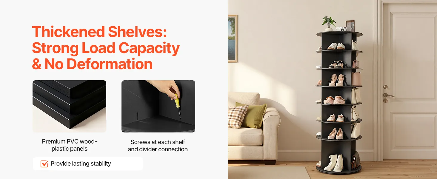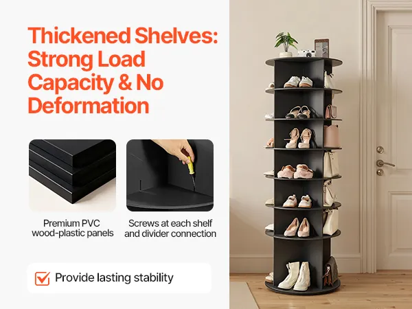 Stevig en duurzaam: Gemaakt van PVC-gecoate hout-kunststofpanelen met verstevigde planken, kan elke plank tot 16 kg dragen. Het draaibare schoenenrek is vormvast. De aan elkaar geschroefde panelen voorkomen verschuiven en wiebelen.