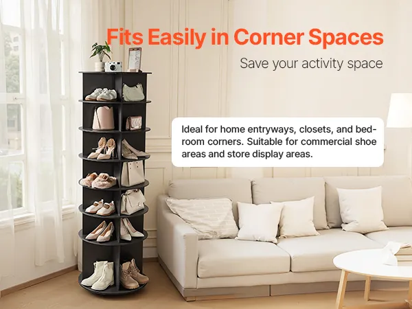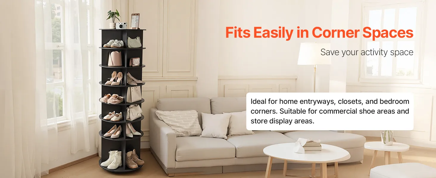 Dankzij het compacte formaat past dit draaibare schoenenrek perfect, zelfs in de kleinste hoekjes. Naast schoenen biedt het ruimte voor tassen, hoeden, sjaals, cd's, boeken, planten en nog veel meer. Ideaal voor thuisgebruik en productpresentatie in winkels.