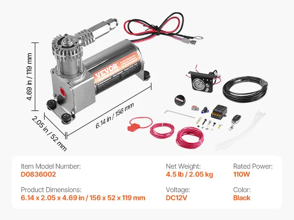 The air ride compressor kit comes with universal connectors, making it compatible with most air suspension compressor systems. During installation, ensure that the hoses and wires are at least 6 inches away from any heat source, such as the exhaust pipe, for optimal safety.