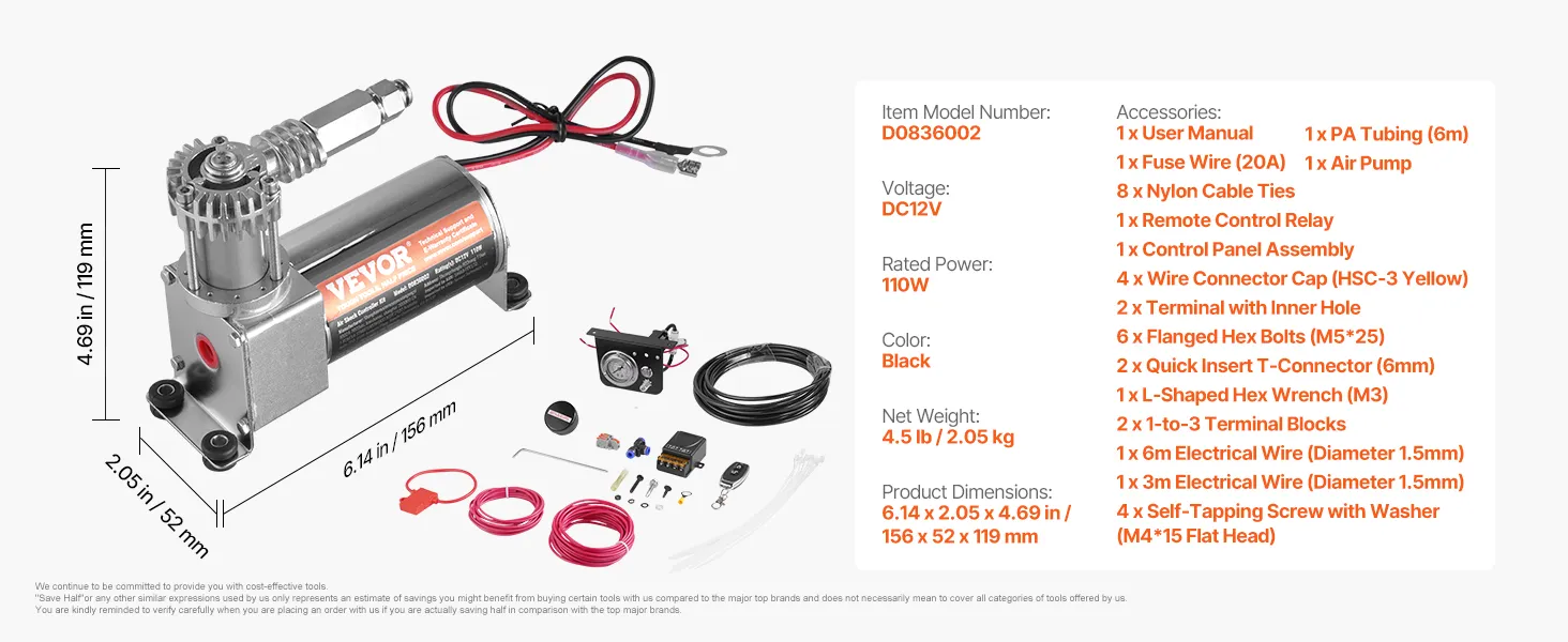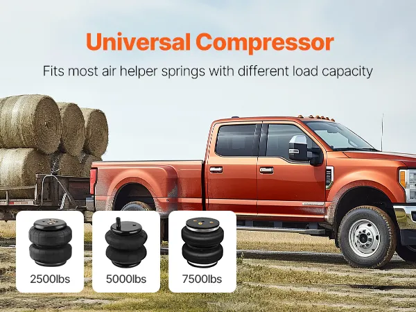 Easy Inflation: This air suspension compressor kit supports up to 100 PSI and is compatible with air suspension systems ranging from 2500 lbs to 7500 lbs. It quickly inflates air springs, offering a smooth and comfortable ride for various vehicles using air suspension systems.