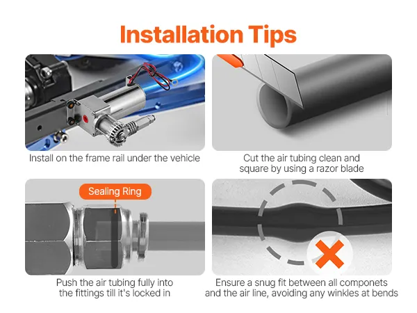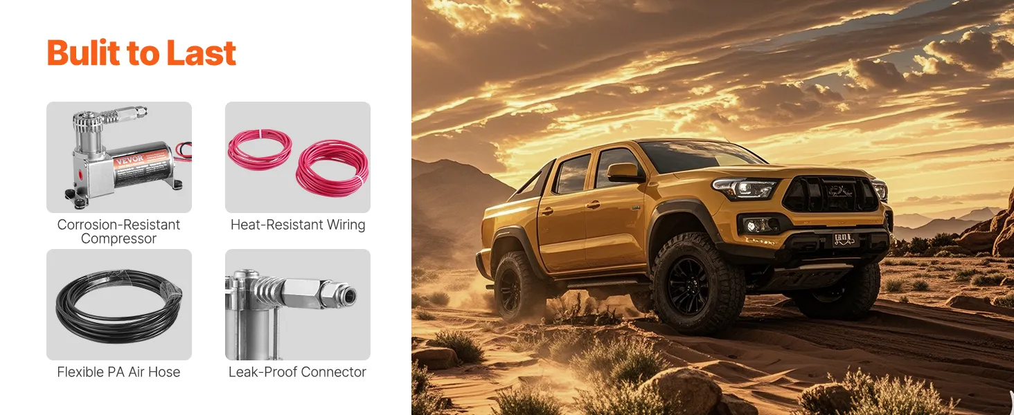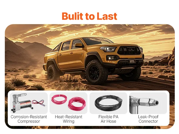 Durable Construction: The air ride compressor kit includes high-temperature-resistant cables and flexible PA air hoses for leak-proof connections. Designed to withstand tough road conditions, it ensures long-lasting, reliable performance for your air suspension kit.