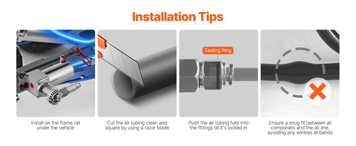 Smooth Driving: The on board air compressor system uses a single path system to evenly distribute air pressure across both air springs, ensuring stable lifting and smooth driving when towing or carrying heavy loads