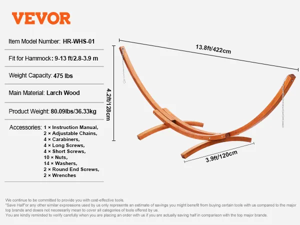 VEVOR Wooden Hammock Stand, 475 lbs Capacity Universal 2 Person Hammock Frame Fits 9-13 ft Hammocks, Larch Wood Arc Adjustable Stand for Hammock with Chain and Carabiner, for Outdoor and Indoor