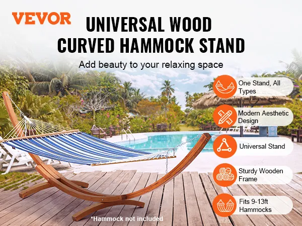 Our hammock stand for outside is designed to support both single and double hammocks ranging from 9 to 13 feet, perfect for personal relaxation or chilling with close ones. It accommodates various hammock types including Brazilian, Curved, and Spreader Bar hammocks.