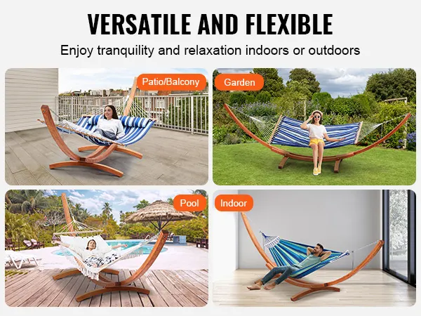 Flexible Use: Suitable for both indoor and outdoor settings, this hammock stand can be easily set up on a balcony, garden, courtyard, porch, or indoors in your living room, bedroom, or patio, allowing you to enjoy tranquility and relaxation anywhere, anytime.