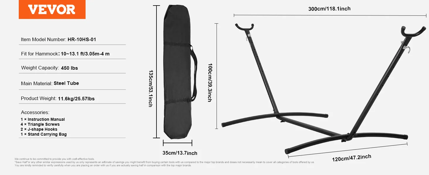 Large Size Stand: Overall dimensions: 118.1 x 47.2 x 39.3 inch, this hammock stand fits hammocks ranging from 10 to 13 feet, ideal for single or double use. Enjoy relaxing swings with family, friends, and loved ones on your hammock!